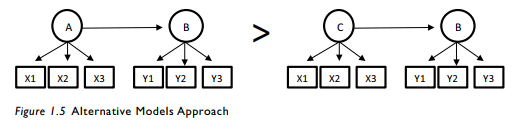 - Alternative Models Approach—more than one theoretical model is suggested, and you test to see which one has a superior fit (Figure 1.5). Most of the time, researchers are hard pressed to find two alternative models supported by the literature.
