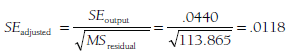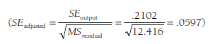 Using a statistical software package (e.g., SPSS or SAS), I regress the effect sizes (Zrs) onto the three dummy variables (DV1, DV2, and DV3), weighted by the inverse variance weight (w) (here, I am requesting that the program include the constant in the model because I have not used the constant as a predictor). The output from the ANOVA table of this regression parallels the results from the ANOVA I described in Section 9.1: The total sum of squares (SStotal) provides the total heterogeneity (Qtotal) = 350.71; the residual or error sum of squares (SSresjdual or SSerror) provides the within-group heterogeneity (Qwithin) = 285.57; and the regression or model sum of squares (SSreqression or SSmodel) provides the between-group heterogeneity (Qbetween) = 65.14. This last value is compared to a c2 distribution (e.g., Table 8.2) to evaluate whether the categorical moderator is significant. This regression analysis also yields coefficients and their (incorrect) standard errors. If I adjust these standard errors, I can evaluate the statistical significance of the regression coefficients as indicative of whether each group differs from the reference group. To illustrate: In this example, in which I coded observational methods as the reference group, I could consider the regression coefficient of DV2 (denoting use of peer reports) = .301 by dividing it by the corrected standard error