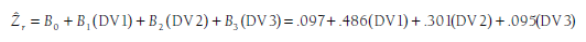 Because I used observational methods as my reference group, the implied mean effect size for this group is Zr = .097. For studies using parent reports (the first dummy variable), the implied effect size is Zr = .583 (.097 + .486); for studies using peer reports (the second dummy variable), the implied effect size is Zr = .398 (.097 + .301); and so on. When using transformed effect sizes such as Zr, you should transform these implied values back to the more intuitive metric (e.g., r) for reporting.