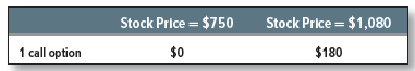 If Amazon’s stock price falls to $750, the call option will be worthless, but if the price rises to $1,080, the option will be worth $1,080 – 900 = $180. The possible payoffs to the option are therefore as follows: