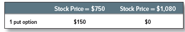 If Amazon’s stock price rises to $1,080, the option to sell for $900 will be worthless. If the price falls to $750, the put option will be worth $900 – 750 = $150. Thus, the payoffs to the put are