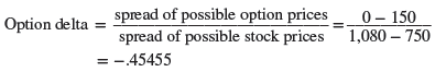 Valuing the Amazon call option may well have seemed like pulling a rabbit out of a hat. To give you a second chance to watch how it is done, we will use the same method to value another option—this time, the six-month Amazon put option with a $900 exercise price.[3] We continue to assume that the stock price will either rise to $1,080 or fall to $750.