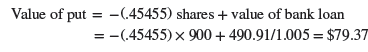 Notice that the delta of a put option is always negative; that is, you need to sell delta shares of stock to replicate the put. In the case of the Amazon put you can replicate the option payoffs by selling .45455 Amazon share and lending the present value of $490.91. Since you have sold the share short, you will need to lay out money at the end of six months to buy it back, but you will have money coming in from the loan. Your net payoffs are exactly the same as the payoffs you would get if you bought the put option: