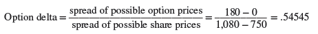 To value the Amazon option, we borrowed money and bought stock in such a way that we exactly replicated the payoff from a call option. This is called a replicating portfolio. The number of shares needed to replicate one call is called the hedge ratio or option delta. In our Amazon example, one call is replicated by a levered position in .54545 share. The option delta is, therefore, .54545.