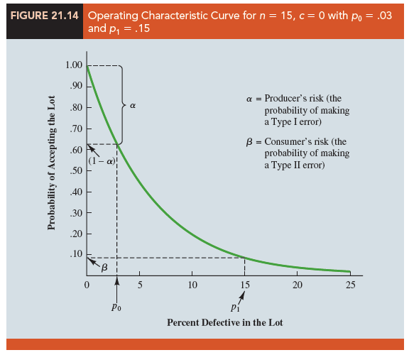 Suppose that for the KALI problem, the managers specify that p0 = .03 and p1 = .15. From the OC curve for n = 15, c = 0 in Figure 21.14, we see that p0 = .03 provides a producer’s risk of approximately 1 – .63 = .37, and p1 = .15 provides a consumer’s risk of approximately .09. Thus, if the managers are willing to tolerate both a .37 probability of rejecting a lot with 3% defective items (producer’s risk) and a .09 probability of accepting a lot with 15% defective items (consumer’s risk), the n = 15, c = 0 acceptance sampling plan would be acceptable.