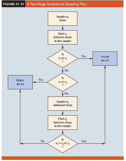 The logic of a two-stage, or double-sample, plan is shown in Figure 21.15. Initially a sample of n1 items is selected. If the number of defective components x1 is less than or equal to c1, accept the lot. If x1 is greater than or equal to c2, reject the lot. If x1 is between c1 and c2 (c1 < x1 < c2), select a second sample of n2 items. Determine the combined, or total, number of defective components from the first sample (x1) and the second sample (x2). If x1 + x 2 < c3, accept the lot; otherwise reject the lot. The development of the double-sample plan is more difficult because the sample sizes n1 and n2 and the acceptance numbers c1, c2, and c3 must meet both the producer’s and consumer’s risks desired.