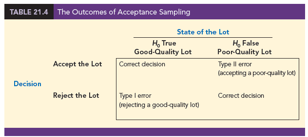 Table 21.4 shows the results of the hypothesis testing procedure. Note that correct decisions correspond to accepting a good-quality lot and rejecting a poor-quality lot.