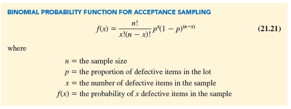 The key to analyzing both the producer’s risk and the consumer’s risk is a “what-if ” type of analysis. That is, we will assume that a lot has some known percentage of defective items and compute the probability of accepting the lot for a given sampling plan. By varying the assumed percentage of defective items, we can examine the effect of the sampling plan on both types of risks.