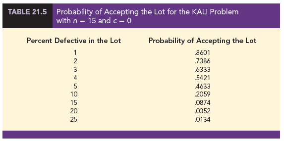 Using the probabilities in Table 21.5, a graph of the probability of accepting the lot versus the percent defective in the lot can be drawn as shown in Figure 21.12. This graph, or curve, is called the operating characteristic (OC) curve for the n = 15, c = 0 acceptance sampling plan.