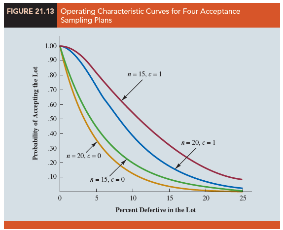Continuing these calculations, we obtain Figure 21.13, which shows the operating characteristic curves for four alternative acceptance sampling plans for the KALI problem. Samples of size 15 and 20 are considered. Note that regardless of the proportion defective in the lot, the n = 15, c = 1 sampling plan provides the highest probabilities of accepting the lot. The n = 20, c = 0 sampling plan provides the lowest probabilities of accepting the lot; however, that plan also provides the highest probabilities of rejecting the lot.
