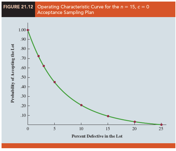 Using the probabilities in Table 21.5, a graph of the probability of accepting the lot versus the percent defective in the lot can be drawn as shown in Figure 21.12. This graph, or curve, is called the operating characteristic (OC) curve for the n = 15, c = 0 acceptance sampling plan.