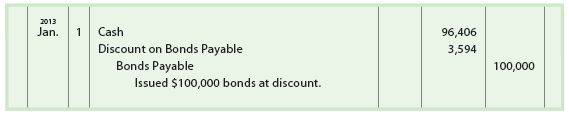 The account, Discount on Bonds Payable, is a contra account to Bonds Payable and has a normal debit balance. It is subtracted from Bonds Payable to determine the carrying amount (or book value) of the bonds payable. Thus, after the preceding entry, the carrying amount of the bonds payable is $96,406 ($100,000 – $3,594).