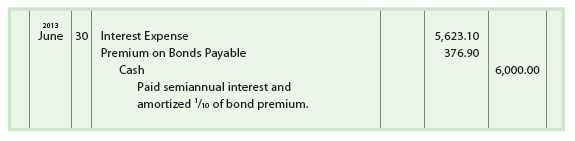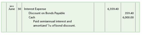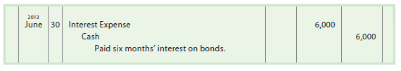 Every six months (on June 30 and December 31) after the bonds are issued, interest of $6,000 ($100,000 X 12% X !%) is paid. The first interest payment on June 30, 2013, is recorded as follows: