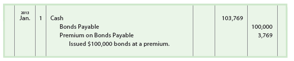 The account, Premium on Bonds Payable, has a normal credit balance. It is added to Bonds Payable to determine the carrying amount (or book value) of the bonds payable. Thus, after the preceding entry, the carrying amount of the bonds payable is $103,769 ($100,000 1 $3,769).