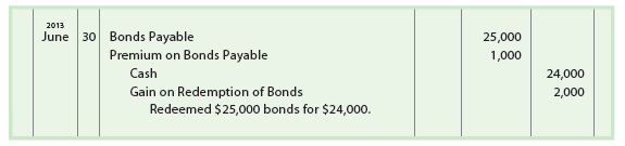 On June 30, 2013, the corporation redeemed one-fourth ($25,000) of these bonds in the market for $24,000. The entry to record the redemption is as follows: