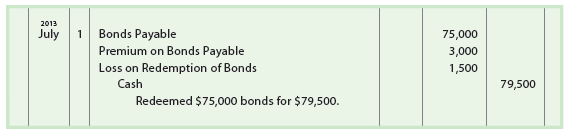 Assume that the corporation calls the remaining $75,000 of outstanding bonds, which are held by a private investor, for $79,500 on July 1, 2013. The entry to record the redemption is as follows: