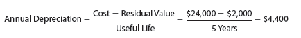 For the preceding equipment, the annual depreciation of $4,400 can be computed by multiplying the depreciable cost of $22,000 by 20% (100%/5).