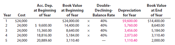 For the first year, the book value of the equipment is its initial cost of $24,000. After the first year, the book value (cost minus accumulated depreciation) declines and, thus, the depreciation also declines. The double-declining-balance depreciation for the full five-year life of the equipment is shown below.