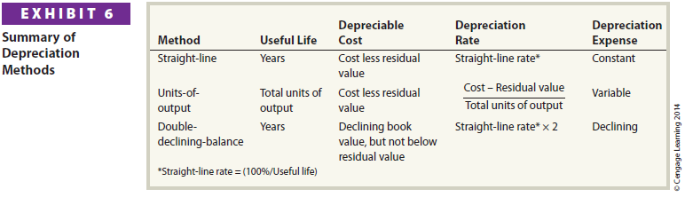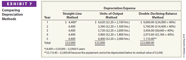 The depreciation for the straight-line, units-of-output, and double-decliningbalance methods is shown in Exhibit 7. The depreciation in Exhibit 7 is based on the equipment purchased in our prior illustrations. For the units-of-output method, we assume that the equipment was used as follows: