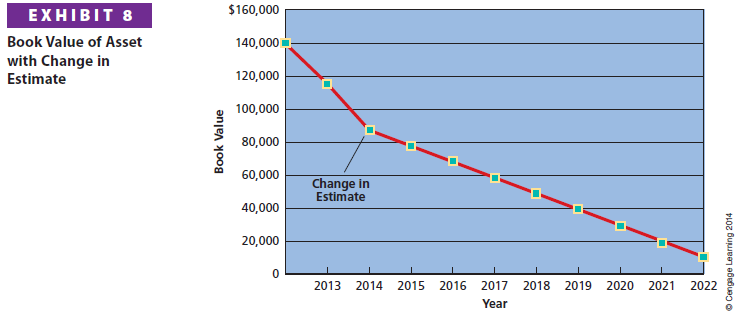 Exhibit 8 shows the book value of the asset over its original and revised lives. After the depreciation is revised at the end of 2014, book value declines at a slower rate. At the end of year 2022, the book value reaches the revised residual value of $8,000.