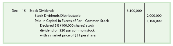 On December 15, Hendrix Corporation declares a stock dividend of 5% or 100,000 shares (2,000,000 shares x 5%) to be issued on January 10 to stockholders of record on December 31. The market price of the stock on December 15 (the date of declaration) is $31 per share.