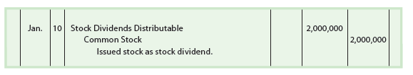 On January 10, the stock dividend is distributed to stockholders by issuing 100,000 shares of common stock. The issuance of the stock is recorded by the following entry: