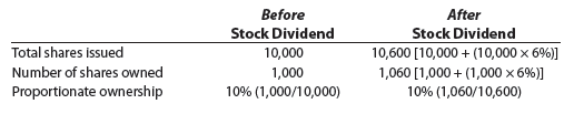 To illustrate, assume a stockholder owns 1,000 of a corporation’s 10,000 shares outstanding. If the corporation declares a 6% stock dividend, the stockholder’s proportionate interest will not change, as shown below.