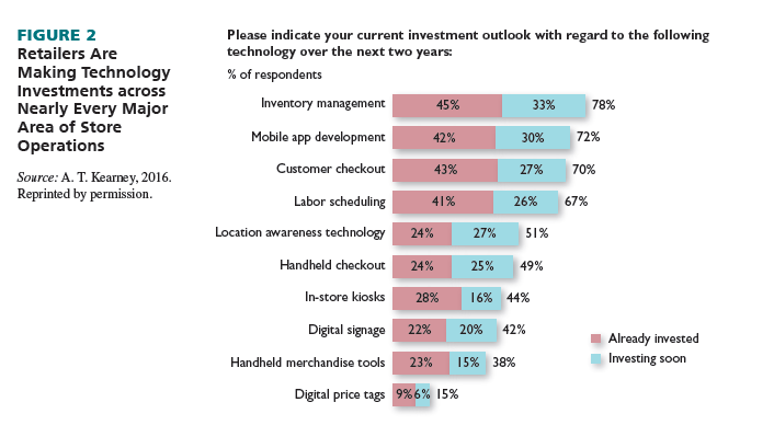 This year’s study finds once again that retailers are investing heavily in technology, yet are still struggling with figuring out its value. Technology is the number-one area of investment according to respondents in our 2016 study, with nearly every respondent saying they will invest in it. Yet nearly 60 percent surveyed say their company struggles with executing and measuring its return on investment. These results are slightly better than the findings in 2013, yet still quite low. See Figure 2.
