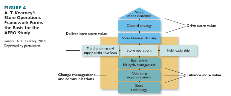 The study is based on A. T. Kearney’s Store Operations Framework; see Figure 4. This framework, which was also used to pioneer the 2010 study, evaluates operations across setting strategic direction, delivering core value, optimizing expenses, and driving lasting change.