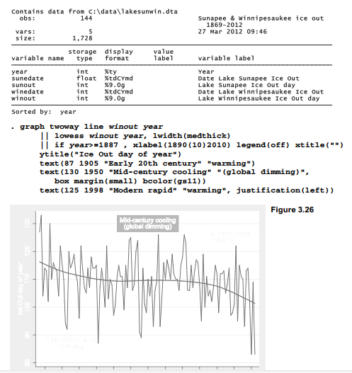 The basic graph in Figure 3.26 is a twoway line plot of Winnepesaukee ice-out day against years from 1887 through 2012. Overlaid on this is a second twoway plot showing a smooth lowess regression curve, drawn with a medium-thick line (lwidth(medthick)) to stand out. Lowess regression, explained in Chapter 8, provides a flexible approach to data smoothing that has several advantages over the better-known moving-average methods. The lowess curve in Figure 3.26 reveals multi-decade trends that underlie the jagged year-to-year variations.