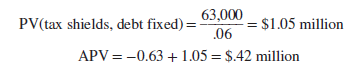 Thus, the project would not be worthwhile with all-equity financing. But it actually supports debt of $5 million. At a 6% borrowing rate (rD = .06) and a 21% tax rate (Tc = .21), annual tax shields are .21 x .06 x 5 = .063, or $63,000.