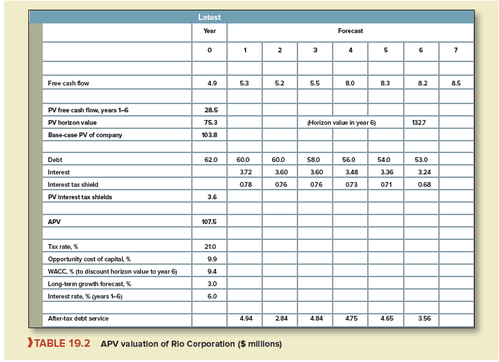 Let’s see how Rio’s APV is affected by this more aggressive borrowing schedule. Table 19.2 shows projections of free cash flows from Table 19.1.26 Now we need Rio’s base-case value. This is its value with all-equity financing, so we discount these flows at the opportunity cost of capital (9.9%), not at WACC. The resulting base-case value for Rio is $28.5 + 75.3 =103.8 million. Table 19.2 also projects debt levels, interest payments, and interest tax shields. If the debt levels are taken as fixed, then the tax shields should be discounted back at the 6% borrowing rate. The resulting PV of interest tax shields is $3.6 million. Thus,