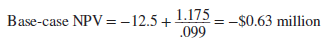 The first step is to calculate base-case NPV. This is the project’s NPV with all-equity financing. To find it, we discount after-tax project cash flows of $1.175 million at the opportunity cost of capital of 9.9% and subtract the $12.5 million outlay. The cash flows are perpetual, so