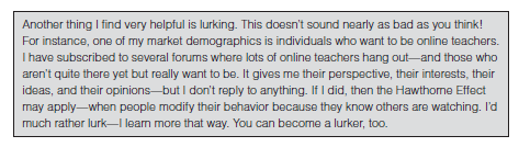 If your demographic is online a lot, you will want to participate in the public online arena. What does this mean? Blogging yourself, responding to blogs, creating an expert site where you offer advice as a go-to person for knowledge on the subject (or want to become one to create loyal buyers and build your reputation), and asking consumers online what they think of your product or service—and being prepared to take the good with the bad.