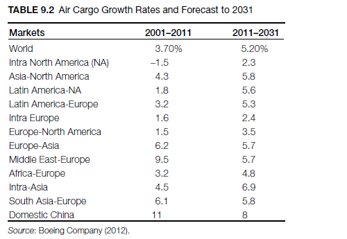 Air cargo traffic has shown slower growth since 2004 (3.7% between 2004 and 2011) compared to its historic growth trend of 6.7% (1981-2004). The major factors contributing to this slowdown include the global economic downturn of 2008 and 2009, rising fuel prices, and overall restrained consumer spending. For example, rising fuel prices have diverted air cargo to land and maritime modes, which are less sensitive to fuel costs. In spite of these challenges, Boeing forecasts that world air cargo traffic is likely to grow by 5.2 percent over the next twenty years (2011-2031) (Boeing Company, 2012). Worldwide airfreight is expected to more than double, increasing from 195 billion revenue ton kilometers (RTKs) in 2011 to 550 billion RTKs in 2031 (Table 9.2). A number of factors are likely to contribute to such growth in airfreight:
