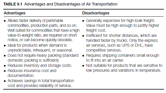 Airfreight accounts for less than 3 percent of world trade by weight and approximately 40 percent of world trade by volume. Demand for airfreight is correlated with world economic growth, fuel prices, and availability/competitiveness of surface transport options. (See Table 9.1 for advantages and disadvantages of this transportation type.)