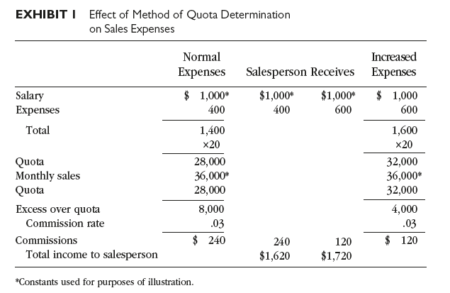 Upon completing the review of the method of quota determination, management concluded that its effect was to increase, rather than decrease, selling expenses. As shown in Exhibit 1, a salesperson who managed to reduce his expenses by $200 in one month received an increase of only $120 in commissions the next month. Thus, sales personnel could make more money by increasing their expenses and quotas than they could by reducing expenses and working with lower quotas. Consequently, a new method of quota determination was adopted. The base for the new monthly quota was the previous year’s sales for the corresponding month; this was adjusted to reflect changes in territorial potential, degree of competition relative to the previous year, and the salesperson’s past performance.
