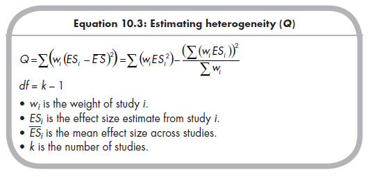 The first step is to estimate the heterogeneity, indexed by Q, in the same way as described in Chapter 8. As you recall, the heterogeneity (Q) is computed using Equation 8.6, reproduced here: