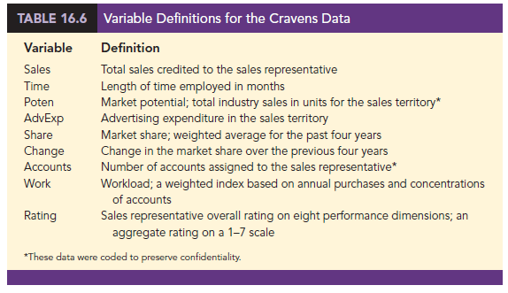 The Cravens data are for a company that sells products in several sales territories, each of which is assigned to a single sales representative. A regression analysis was conducted to determine whether a variety of predictor (independent) variables could explain sales in each territory. A random sample of 25 sales territories resulted in the data in Table 16.5; the variable definitions are given in Table 16.6.