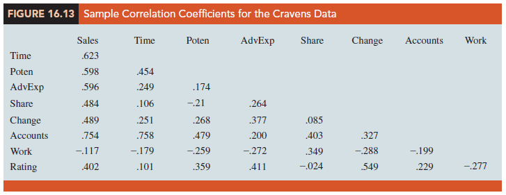 As a preliminary step, let us consider the sample correlation coefficients between each pair of variables. Figure 16.13 is the correlation matrix obtained using statistical software. Note that the sample correlation coefficient between Sales and Time is .623, between Sales and Poten is .598, and so on.