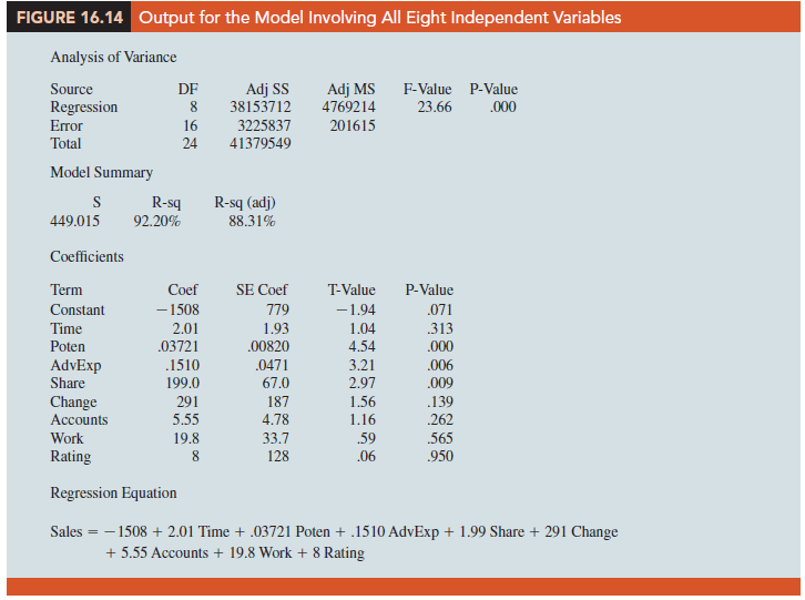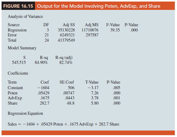 Although there are potential multicollinearity problems, let us consider developing an estimated regression equation using all eight independent variables. Using statistical software, we obtain the results in Figure 16.14. The eight-variable multiple regression model has an R-sq (adj) value of 88.31%. Note, however, that the p-values for the t tests of individual parameters show that only Poten, AdvExp, and Share are significant at the a = .05 level, given the effect of all the other variables. Hence, we might be inclined to investigate the results that would be obtained if we used just those three variables. Figure 16.15 shows the results obtained for the estimated regression equation with those three variables. We see that the estimated regression equation has an R-sq (adj) value of 82.74%, which, although not quite as good as that for the eight-independent-variable estimated regression equation, is high.
