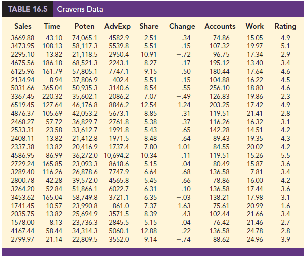 The Cravens data are for a company that sells products in several sales territories, each of which is assigned to a single sales representative. A regression analysis was conducted to determine whether a variety of predictor (independent) variables could explain sales in each territory. A random sample of 25 sales territories resulted in the data in Table 16.5; the variable definitions are given in Table 16.6.