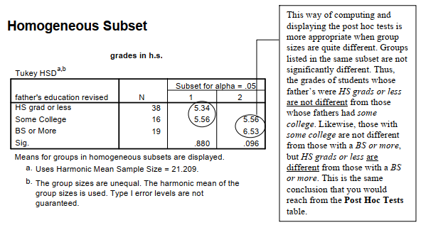 - Check Tukey because, for grades in h.s., the Levene’s test was not significant so we assume that the variances are approximately equal.