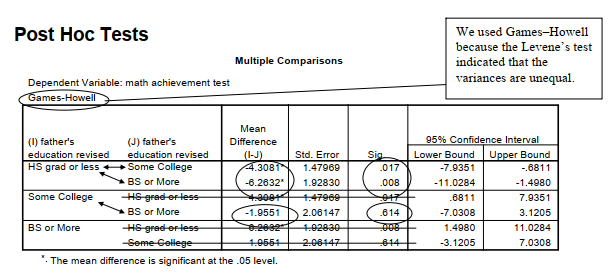 - Check Games-Howell because equal variances cannot be assumed for math achievement.