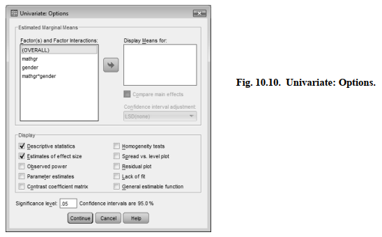 - Select Options and click Descriptive statistics and Estimates of effect size. See Fig. 10.10.