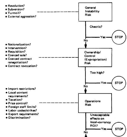 The accompanying checklist presents the many features of a target country’s investment climate that need to be assessed by managers. The checklist is only suggestive, for each investor should develop his own check-list to make certain it covers all the critical variables of the project’s contextual environment. Of special note is the fact that all the items in the checklist depend directly or indirectly on the behavior of the political system in the host country. For that reason, changes in the investment climate will proceed mainly from changes in the behavior of the host government or from general political instability. Because the future is uncertain, management’s assessment of prospective political behavior in the host country can be expressed at most in probability terms. Hence the assessment of a country’s future investment climate is an assessment of the project’s political risk.