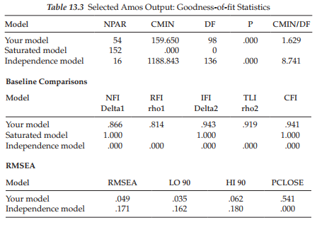Presented in Table 13.1, you will see both the parameter summary and model summary information pertinent to our current incomplete data sample. In the interest of pinpointing any differences between the incomplete and complete (see Table 3.3 and Figure 3.7) data samples, let’s now compare this information with respect to these same sections of the output file. First, notice that, although the number of fixed parameters in the model is the same (20) for the two samples, the number of unlabeled parameters (i.e., estimated parameters) varies, with the incomplete data group having 54, and the complete data sample having 38. The explanation of this discrepancy lies with the estimation of 16 intercepts for the incomplete data sample (but not for the complete data sample). Second, observe that although the number of degrees of freedom (98) remains the same across complete and incomplete data samples, its calculation is based upon a different number of sample moments (152 versus 136), as well as a different number of estimated parameters (54 versus 38). Finally, note that, despite the loss of 25% of the data for the one sample, the overall x2 value remains relatively close to that for the complete data sample (159.650 versus 158.511).