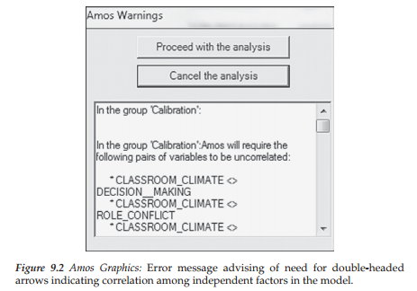 The originally hypothesized model was tested and modified based on data from the calibration sample (Sample A) of high school teachers. The final best-fitting model for this sample is shown schematically in Figure 9.1. It is important to note that, for purposes of clarity, double-headed arrows representing correlations among the independent factors in the model and measurement error terms associated with each of the indicator variables are not included in this figure. Nonetheless, these specifications are essential to the model and must be added before being able to test the model, otherwise Amos will present you with the error message shown in Figure 9.2. Thus, in testing structural equation models using the Amos program, I suggest that you keep two sets of matching model files—one in which you have a cleanly presented figure appropriate for publication purposes, and the other as a working file in which it doesn’t matter how cluttered the figure might be (see, e.g., Figure 9.5).