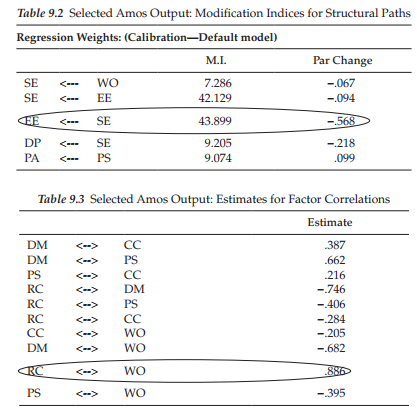 Let’s turn now to Table 9.3 in which estimates of the factor correlations are presented. Circled, you will observe an estimated value of .886 representing the correlation between Role Conflict and Work Overload, thereby indicating an overlap in variance of approximately 78% (.886 x .886). Recall that we noted the same problematic correlation with respect to analyses for elementary teachers (see Chapter 6). As explained in Chapter 6, Role Conflict and Work Overload represent two subscales of the same measuring instrument (Teacher Stress Scale). Thus, it seems evident that the related item content is less than optimal in its measurement of behavioral characteristics that distinguish between these two factors.