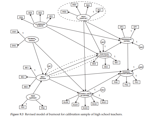 Before taking a look at the parameter estimates, however, it is important that I make mention of the other large modification index (42.129), representing the same path noted above, albeit in reverse (from Emotional Exhaustion to Self-esteem). Given the similar magnitude (relatively speaking) of these two indices, I’m certain that many readers will query why this parameter also is not considered for inclusion in the model. In this regard, I argue against its inclusion in the model for both statistical and substantive reasons. From a statistical perspective, I point to the related parameter change statistic, which shows a negligible value of -.094, clearly indicative of its ineffectiveness as a parameter in the model. From a substantive perspective we need to remember the primary focus of the original study, which was to identify determinants of teacher burnout. Within this framework, specification of a path flowing from Emotional Exhaustion (EE) to Self-esteem (SE) would be inappropriate as the direction of prediction (in this case) runs counter to the intent of the study.